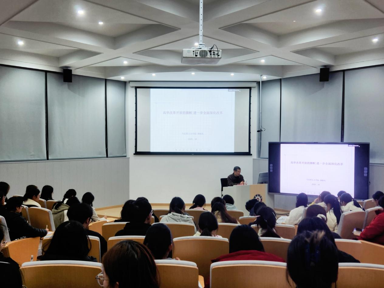 党课第二讲由马克思主义学院郭晓先教授主讲,他以“高举改革开放的旗帜,进一步全面深化改革”为主题,从习近平总书记强调进一步深化改革开放、为什么要全面深化改革、47年改革开放的巨大成就、改革开放的基本脉络和将改革开放进行到底五个方面来讲述。通过对改革开放的讲述,他号召同学们要坚定理想信念,要不断筑牢信仰之基,坚持把人生理想融入党和国家的事业之中,奋力谱写时代新篇章。