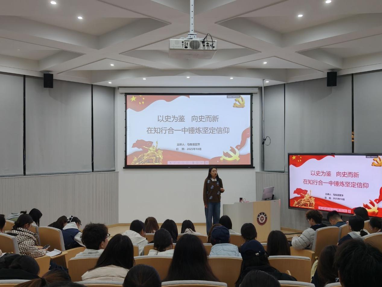 党课第三讲由马克思主义学院老师潘亚萍主讲,她以“以史为鉴,向史而新,在知行合一中锤炼坚定信仰”为主题,从“没有共产党就没有新中国”“没有共产党就没有社会主义中国”“没有共产党就没有中国特色社会主义”“党的光辉历程给我们的深刻启示”四个方面展开,结合鲜活党史案例与理论阐释。同学们表示,将深耕党的创新理论、立足学业服务同学、融入民族复兴伟业,向合格党员看齐,争取早日为党贡献力量。