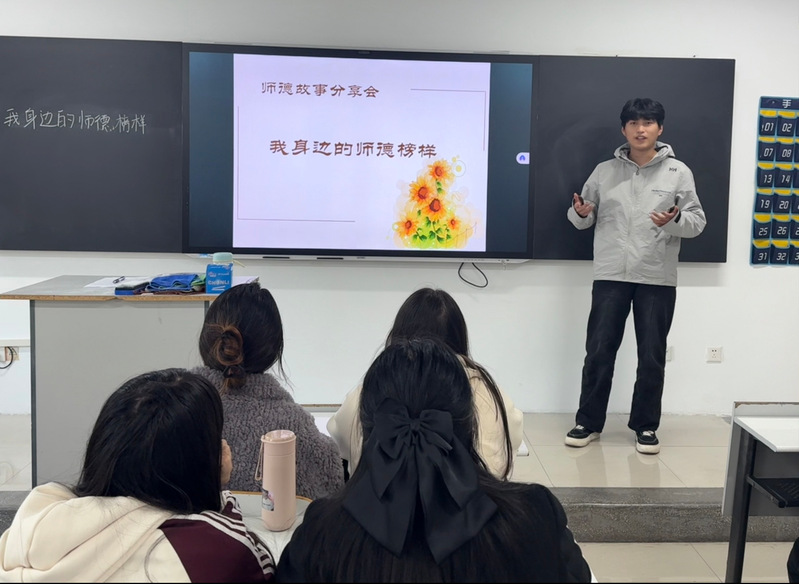 “我身边的师德榜样”故事分享会上,同学们踊跃分享在教育实践中亲历的感人故事。那些关于无私关爱、智慧引导的真实案例,通过同学们质朴真诚的讲述,让抽象的师德规范变得具体而生动。这种以情动人、以事化人的方式,极大地激发了同学们的情感共鸣,强化了职业认同与从教初心。
