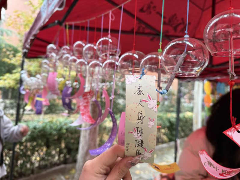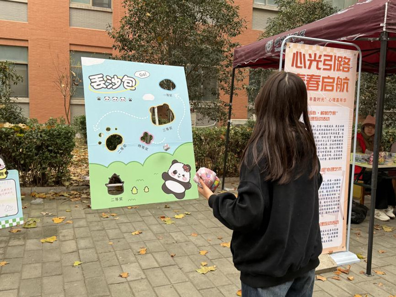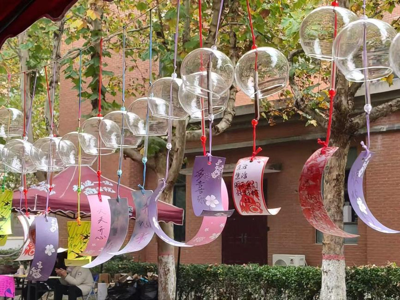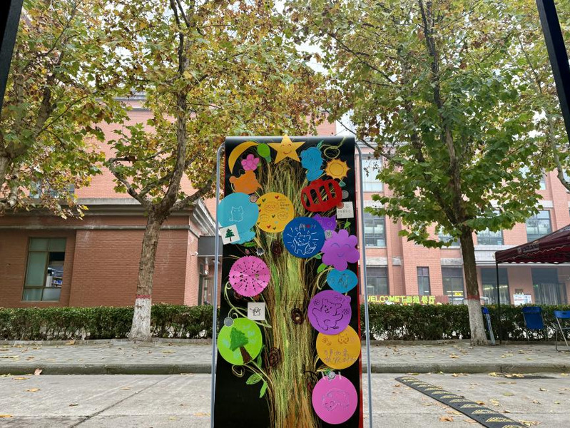 秋日微风下,师生们执笔在素雅卡片上静静书写下内心的烦恼与期许,将其系于廊下的风铃装置。活动现场特设的“解忧回音区”内,许多人在陌生的卡片前驻足,留下“请相信你的勇敢”“前方有光”等真挚鼓励,让文字成为连接心灵的桥梁,传递着深切的心理支持。活动中,大家在艺术创作中抒发内心思绪,在集体协作中感受联结的力量。