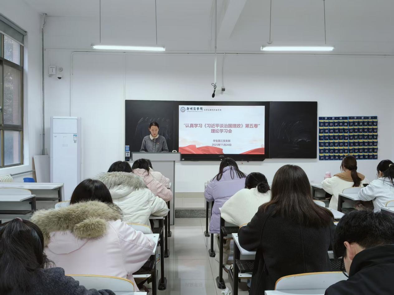 为深化理论武装、凝聚奋进力量,大力推动支部成员学懂弄通做实习近平新时代中国特色社会主义思想。2025年11月20日,文传学院学生第三党支部于自力楼204教室组织召开“学习《习近平谈治国理政》第五卷”主题理论学习会,深入学习这部著作里的重要论述,领会精神实质,凝聚思想共识。