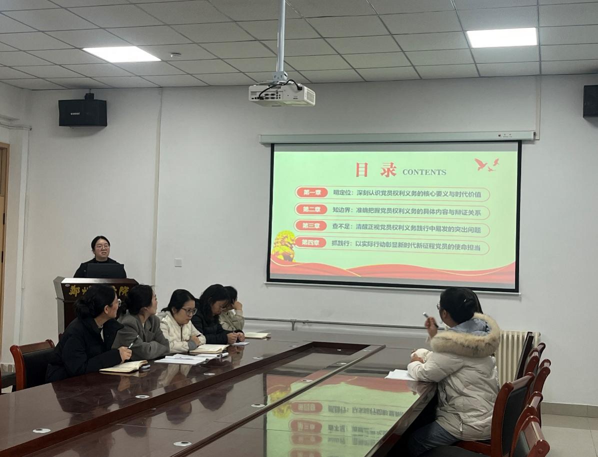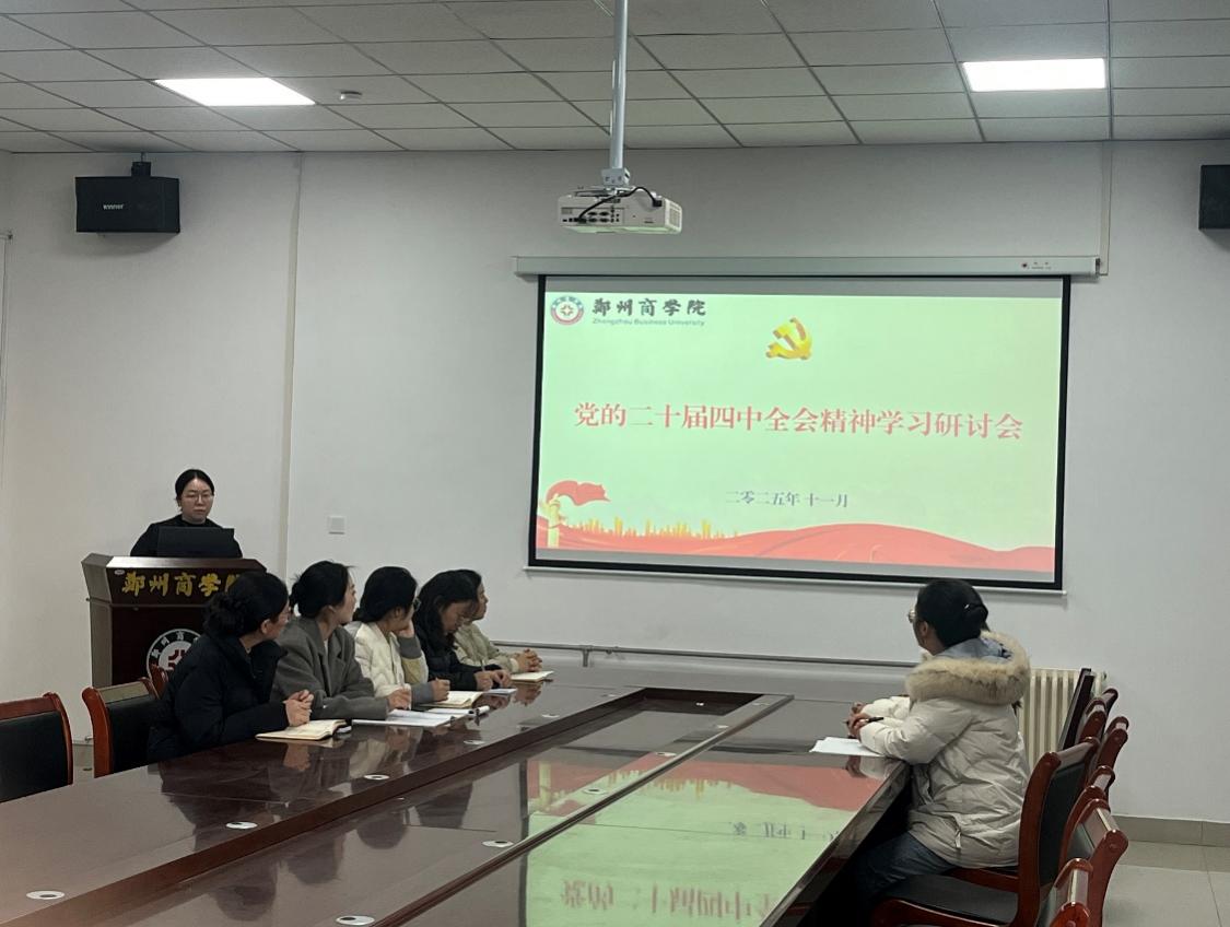 为深入学习贯彻党的二十届四中全会精神,切实把思想和行动统一到党中央决策部署上来,充分发挥教师党员在教育教学中的先锋模范作用,11月20日下午,教师第四党支部在自力楼H216开展了11月份主题党日活动,深入学习贯彻党的二十届四中全会精神。会议由支部书记程果老师主持,支部全体党员共同参加学习和讨论。