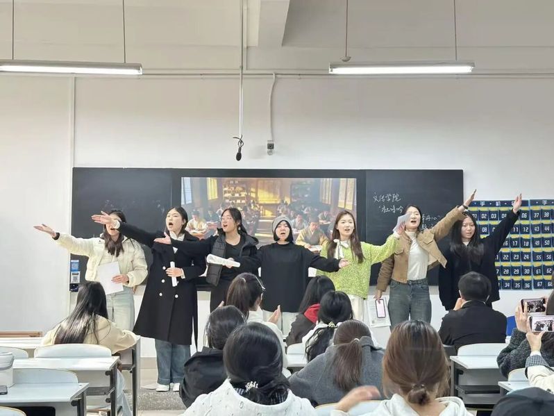 初赛现场,气氛热烈,诗意浓郁。各参赛队伍围绕杜甫的少年豪情、中年忧思与晚年沉郁等不同人生阶段,进行了精彩绝伦的创意演绎。我院学子声情并茂的朗诵与精心设计的情节交相辉映,将《望岳》的壮志、《春望》的沉痛与《登高》的苍凉娓娓道来,生动再现了诗圣的丹心与雅韵,赢得了现场阵阵掌声。