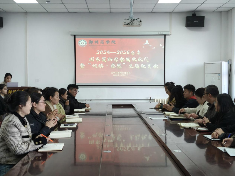 为全面落实国家资助政策,深化资助育人成效,坚持立德树人根本任务,激励广大学子勤奋学习、积极进取,培育学生的感恩意识与社会责任感,11月27日下午,文传学院于自力楼216会议室举办2025-2026学年国家奖助学金颁发仪式暨“诚信·感恩”主题教育活动。文传学院党委书记贾蓓、全体辅导员老师以及获奖受助学生代表共同参与了本次活动。本次会议由我院资助专项负责人姚瑶老师主持。