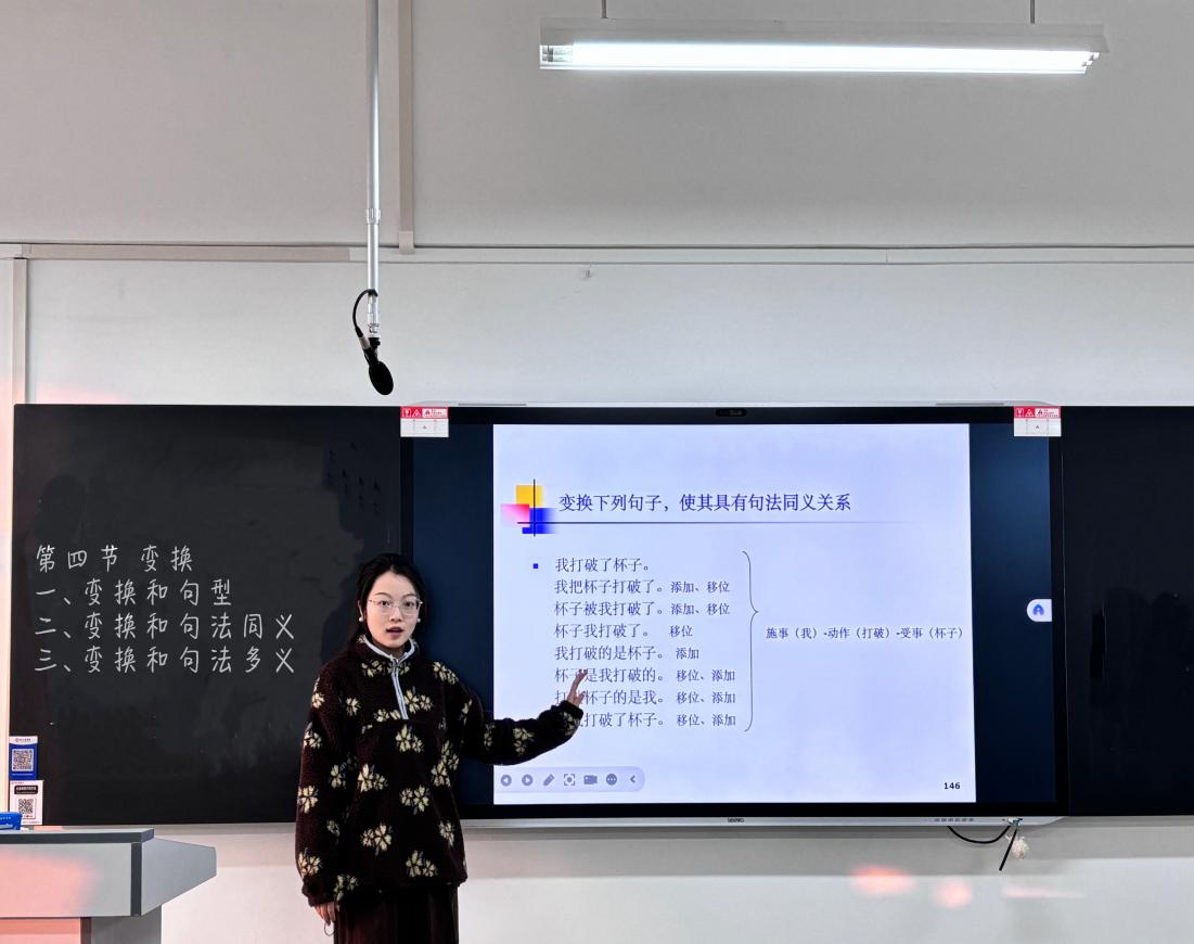 另一方面,李老师创造性地将理论与真实教学场景相融合。她分享在孔子学院教学中的实际案例,如汉语学习者混淆“把”字句和一般主动宾句,或理解“鸡不吃了”这类歧义句时的困难。通过这些案例,她引导学生站在教学者角度思考:如何运用句式变换理论来诊断学习偏误?如何设计教学揭示同义句式间的关联与差异?这种设计增强了课程的实用性与吸引力,不仅让学生体会到语言学知识的应用价值,更潜移默化地培养了教学意识与设计能力,为有志于从事语言教育的学生提供了宝贵的“预演”。