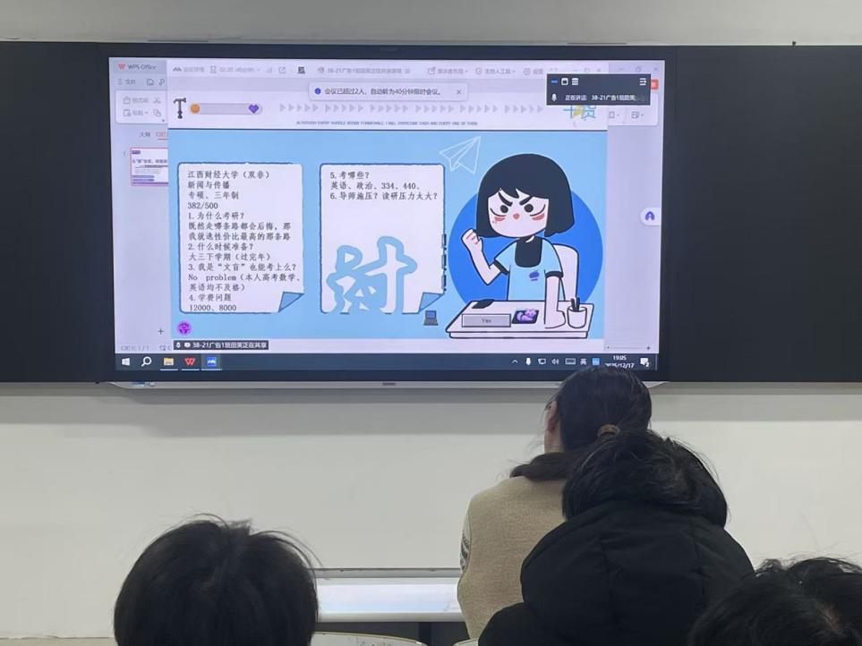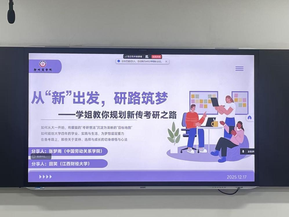 为帮助大一新生明晰考研方向,规划大学成长路径,12月17日,我院新传教研室在H312开展往届新传考研上岸学生分享会。本次分享会邀请了中国劳动关系学院的张梦雨与江西财经大学的田笑两位学生,以亲身经历为新生们解锁考研求学路上的关键密码。