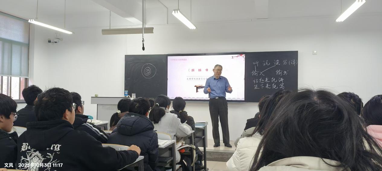 12月3日第4节,在W302教室,化长河老师为25日语1班讲授的《大学语文与经典阅读》课程,重点赏析毕淑敏的散文《提醒幸福》。本次课紧紧围绕“幸福”主题展开,教学设计精妙、目标导向清晰,有效实现了知识传授与能力培养、价值引领的有机统一。