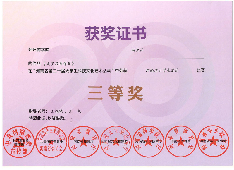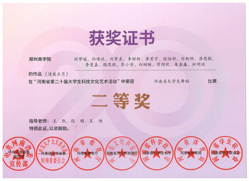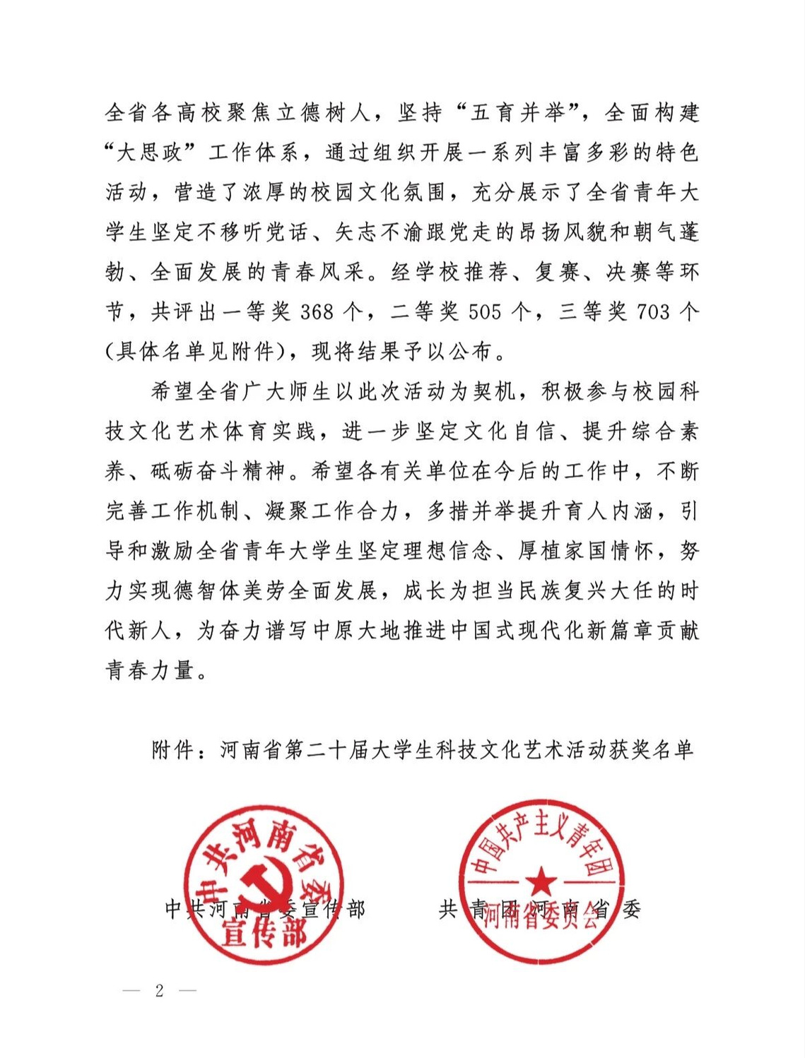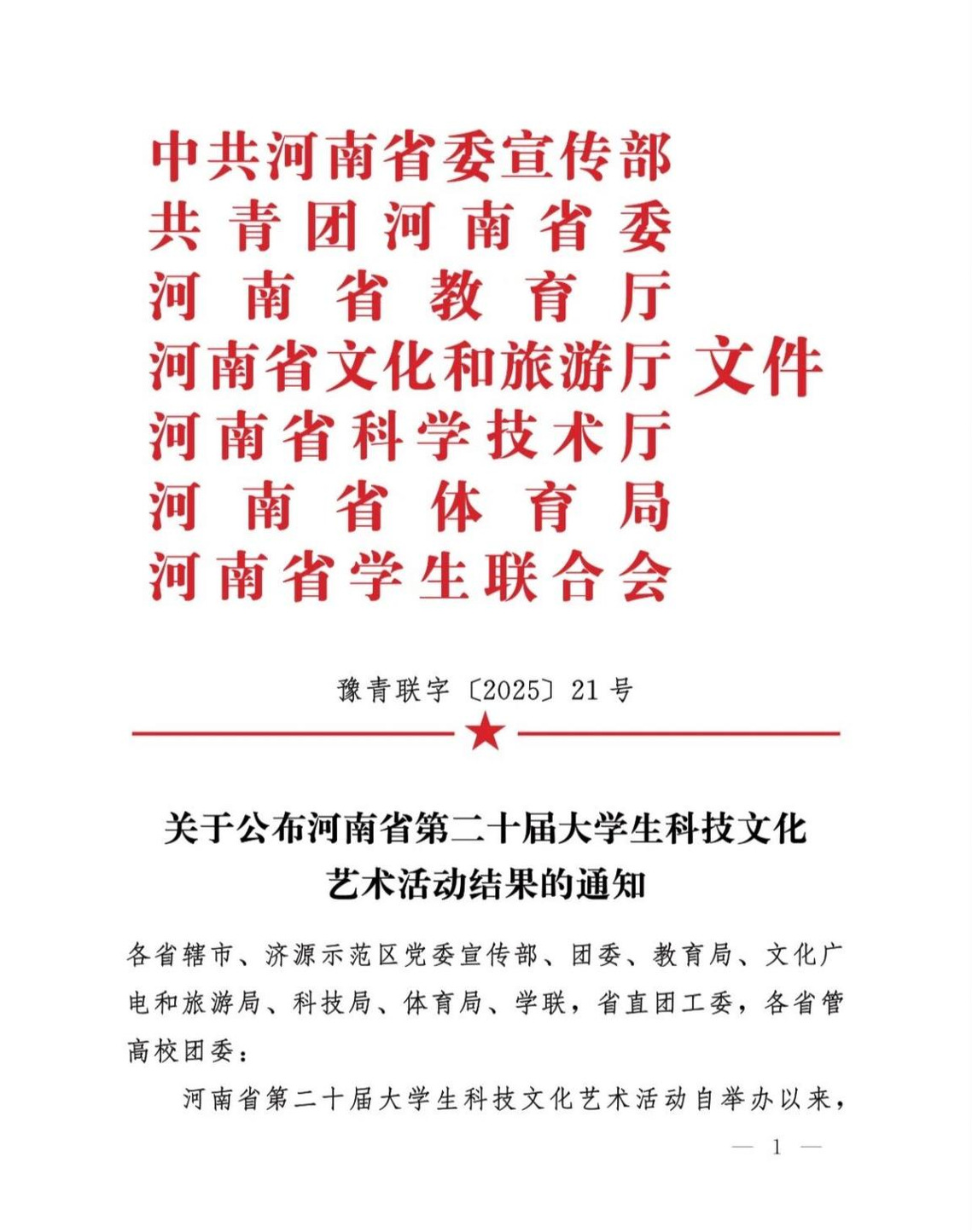 近日,由省委宣传部、省教育厅、共青团河南省委等多部门联合主办的河南省第二十届大学生科技文化艺术节圆满落幕,活动结果正式公布。我院学子在比赛中荣获二等奖1项、三等奖1项,充分展示了我校在校园文化建设和实践育人方面的显著成果。