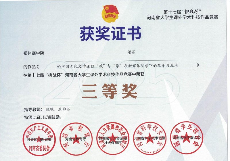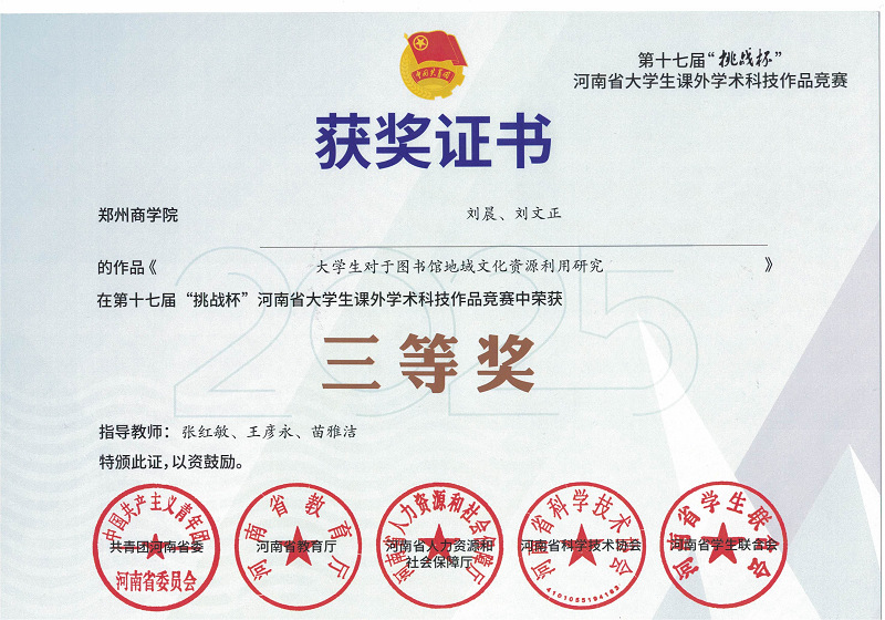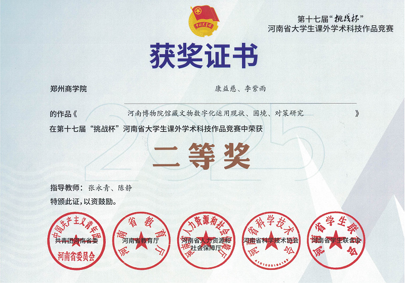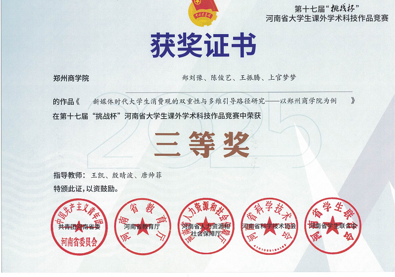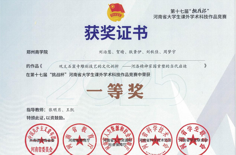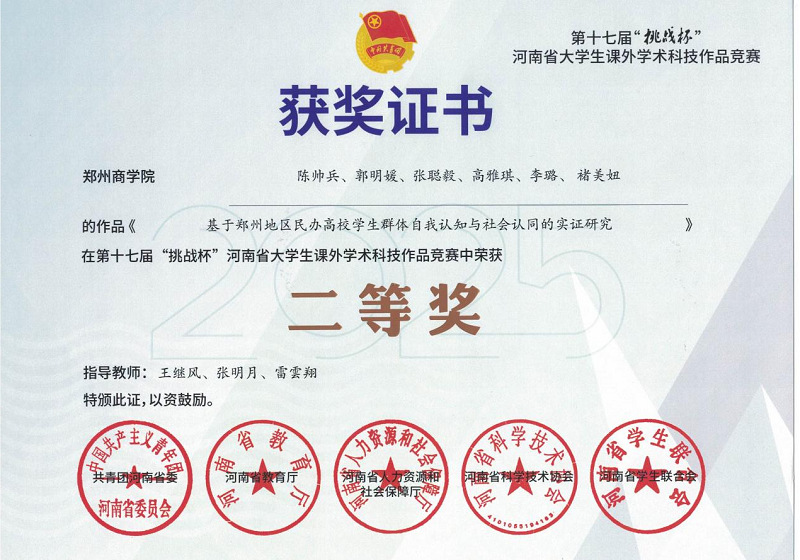 近日,由共青团河南省委、河南省教育厅、河南省社会科学院、河南省科学技术协会、河南省学生联合会联合主办的第十七届“挑战杯”河南省大学生课外学术科技作品竞赛圆满落幕。我院学子凭借扎实的专业知识、突出的创新能力,斩获7项省级荣誉,其中省级一等奖1项、二等奖2项、三等奖4项。
