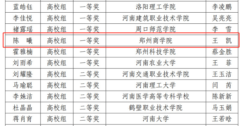 大赛启动以来,学校积极组织选拔赛,对参赛学生开展稿件、演讲视频录制等指导。此次比赛有来自河南大学、河南农业大学等15所高校学生代表参加高校组的角逐,在带队老师的精心指导下,陈曦同学最终获得高校组一等奖。