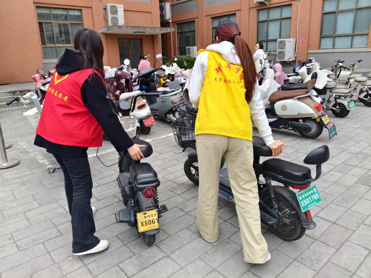 志愿小组规整自力楼前乱停的电动车,引导文明停放,宣传规范停车的意义,以行动弘扬雷锋精神,共建有序校园。