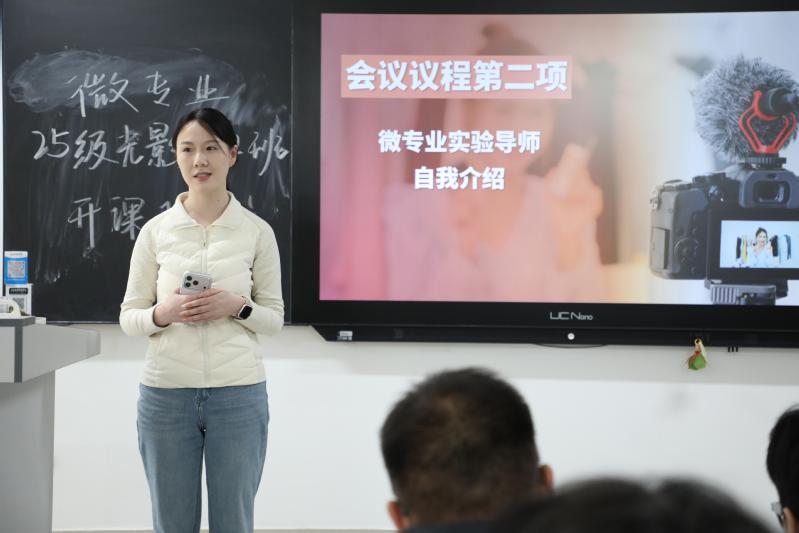 随后,微专业实验导师团队依次进行自我介绍。各位导师分别从专业背景、研究方向及实践经验等方面进行了分享,涵盖短视频内容创作、品牌传播、影像制作、新媒体运营等多个领域,展现出多元融合的师资结构。