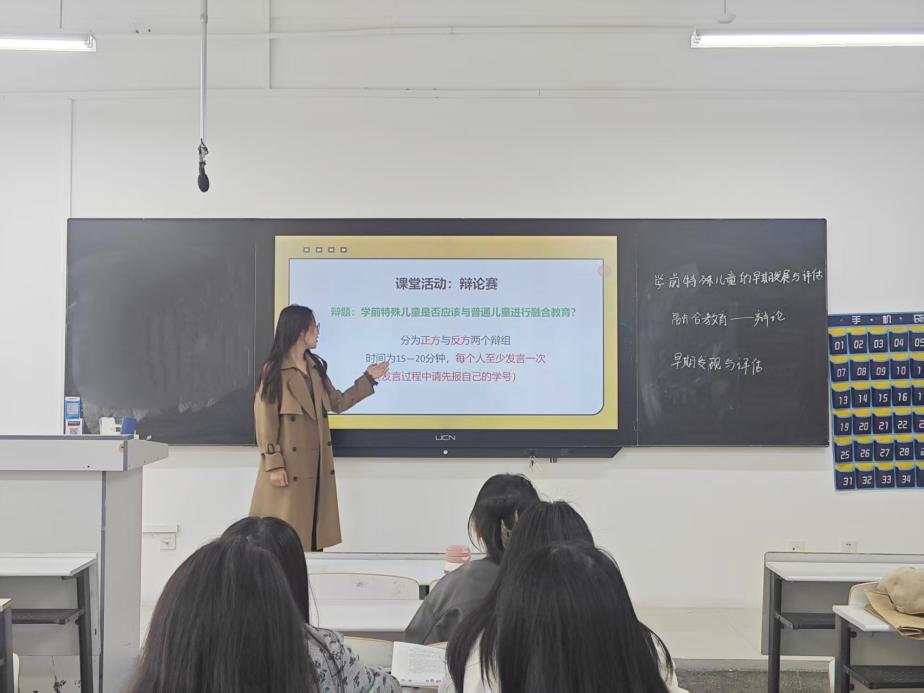 课前,学生已围绕“学前特殊儿童是否应与普通儿童进行融合教育”展开前期调研与资料收集。课上,教师组织十五分钟专题辩论,既完成了上周预设的教学任务,又有力激发了学生对课程核心问题的探究兴趣。在此基础上,教师顺势导入新目标“特殊儿童的早期发现与评估”,实现了教学环节的有机衔接与认知的自然递进。
