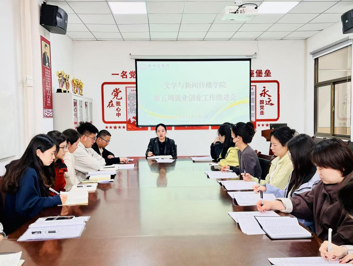 2026年4月7日,文传学院召开本学期第五次就业创业工作推进会。学院党委书记贾蓓、团委书记王凯及全体辅导员共同参会。会上,2026届毕业班各辅导员逐一汇报了所带班级当前的就业进展与升学情况。