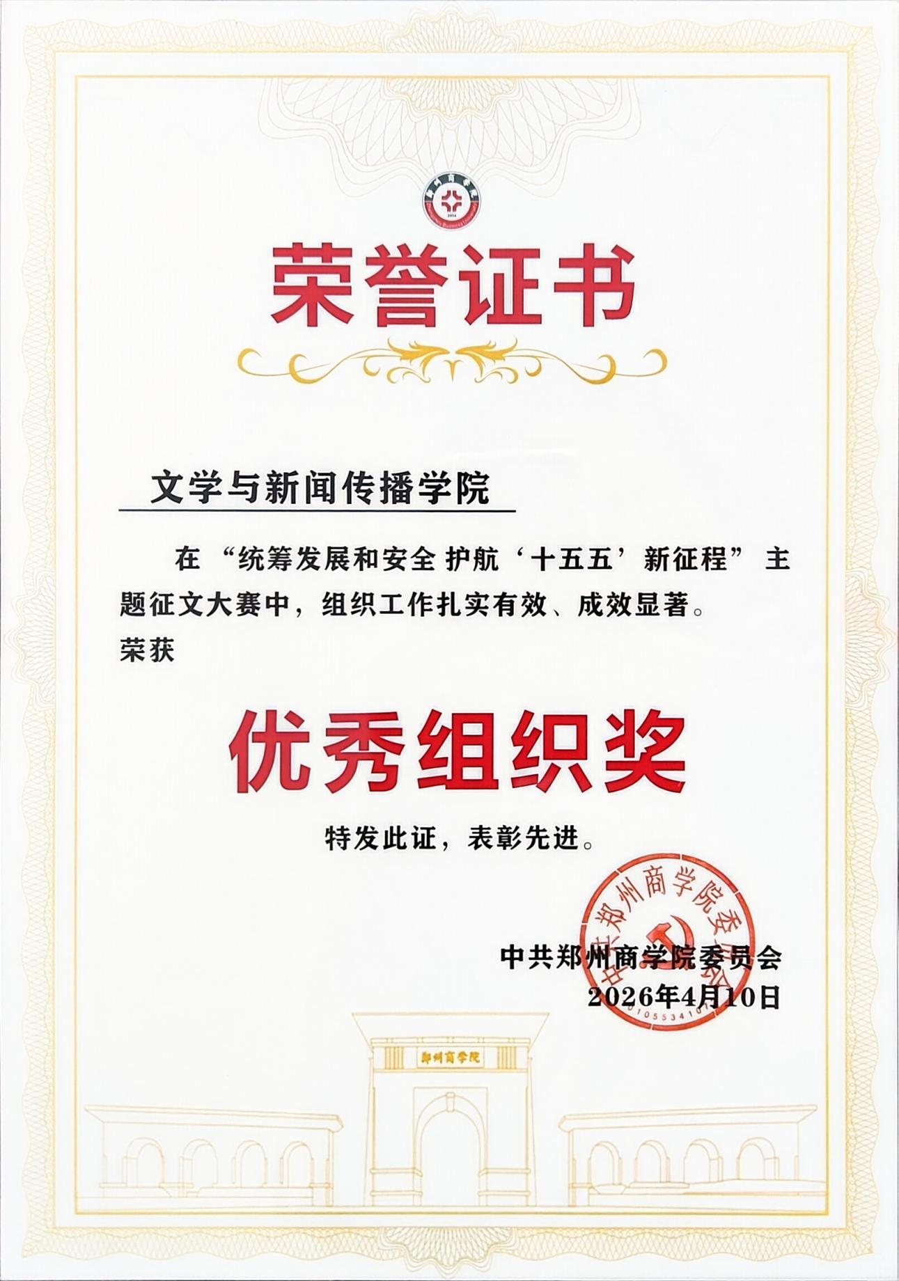 本次大赛是深入学习贯彻党的二十届四中全会精神、践行总体国家安全观的重要平台,自赛事启动以来,学院党委高度重视、精心组织,参赛师生紧扣主题深耕创作,将理论学习与实践感悟深度融合,整体组织工作扎实有效、成效显著,学院荣获“优秀组织奖”。