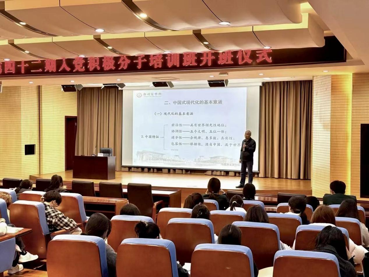 党课第一讲由马克思主义学院李会钦教授主讲,他在党课培训中带领大家系统学习“中国式现代化的世界意义”,阐释了中国式现代化以人民为中心的核心内涵及其五大特征,深刻揭示了其不同于西方模式的世界价值,并勉励学员们要筑牢理论根基、练就专业本领,在服务同学与社会实践中践行青年担当。