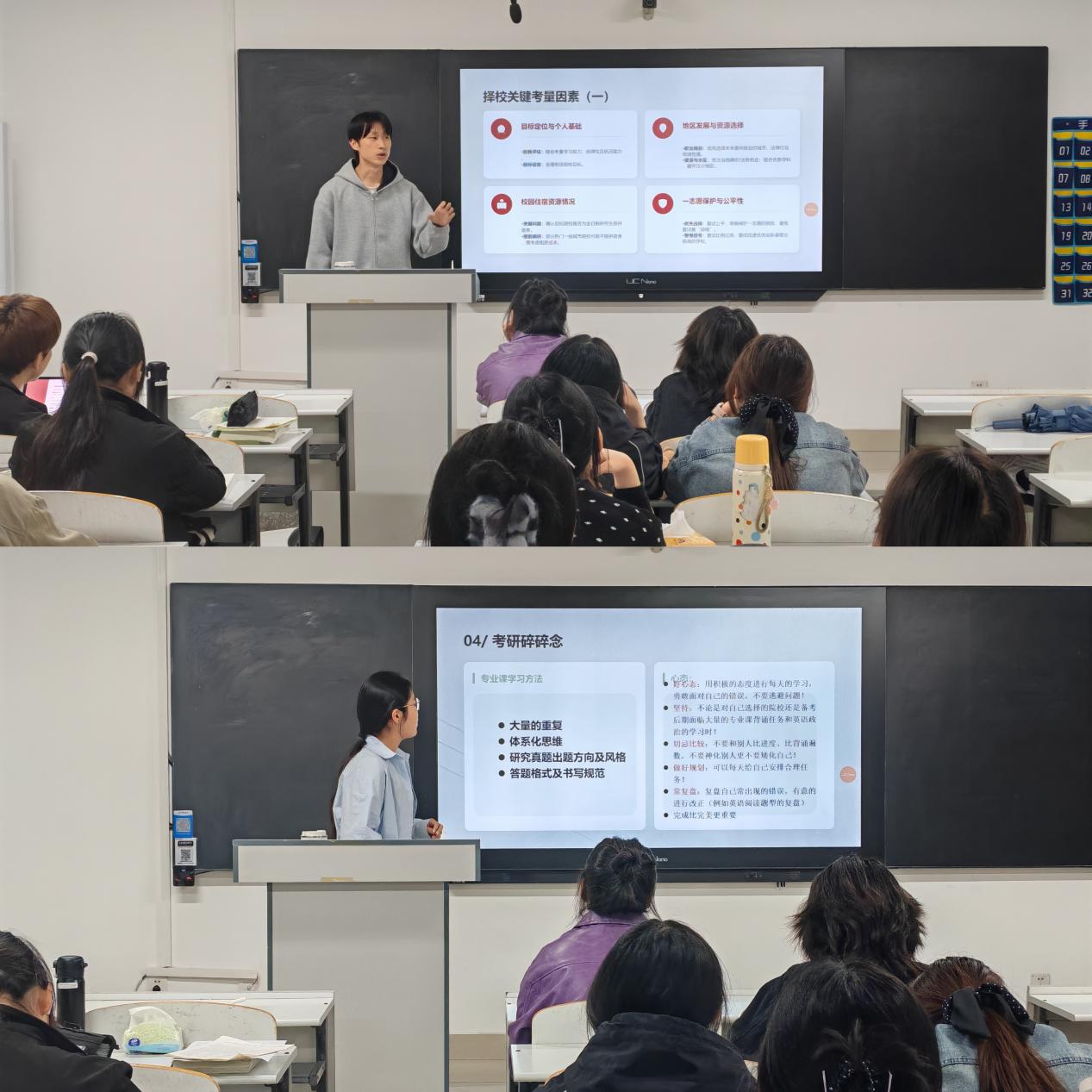 经验分享环节,王子豪、李一凡、徐巾迪、赵慧颖四位优秀学长学姐依次登台,结合自身备考经历,围绕院校选择、复习规划、备考技巧、避坑经验等核心内容展开细致分享。针对择校问题,他们结合专业特色、院校实力、报录比等因素,给出务实建议;在复习安排上,详细拆解专业课与公共课的复习时间分配、阶段进度规划,分享高效记忆、刷题总结、真题利用等实用方法;同时坦诚讲述备考中易踩的“坑”,提醒学弟学妹避开误区、少走弯路,兼顾学习效率与身心健康。四位嘉宾分享内容干货满满、贴合实际,为在场学子提供了清晰可落地的备考参考。