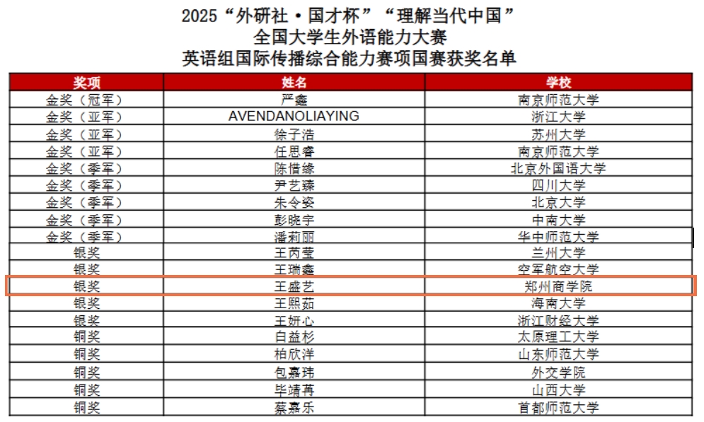 近日,2025年全国大学生外语能力大赛总决赛落下帷幕。郑州商学院外国语学院英语专业王盛艺同学凭...