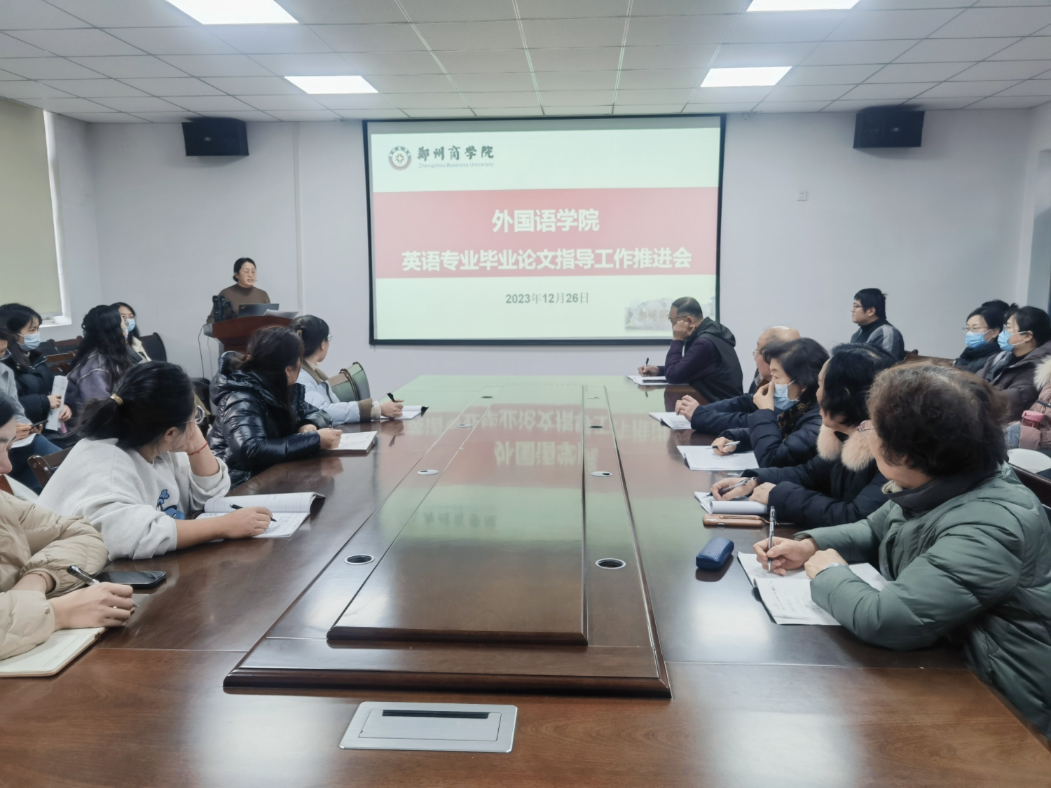 为贯彻落实学校毕业论文工作精神,进一步做好2024届本科毕业论文工作,12月26日下午,我院在W209召开了2024届英语专业毕业论文工作推进会,我院副院长赵保成、英语专业教研室主任程玮、全体2024届英语专业本科毕业论文指导教师参加此次会议。