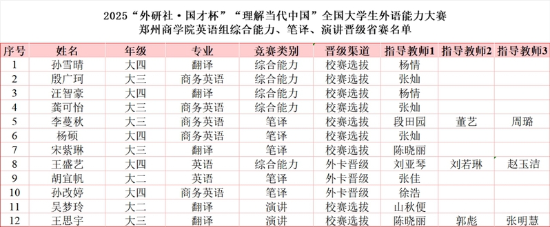 通过校赛选拔,我院孙雪晴、殷广珂、汪智豪、龚可怡晋级综合能力省赛;李蔓秋、杨硕、宋紫琳晋级笔译省赛;吴梦玲、王思宇晋级演讲省赛。此外,我院王盛艺、胡宜帆、孙改婷三位同学通过河南省国才外卡通道直接晋级省赛。在指导老师的倾力指导下,同学们正以饱满的热情积极备赛,预祝同学们能在下一阶段的比赛中获得优异成绩!