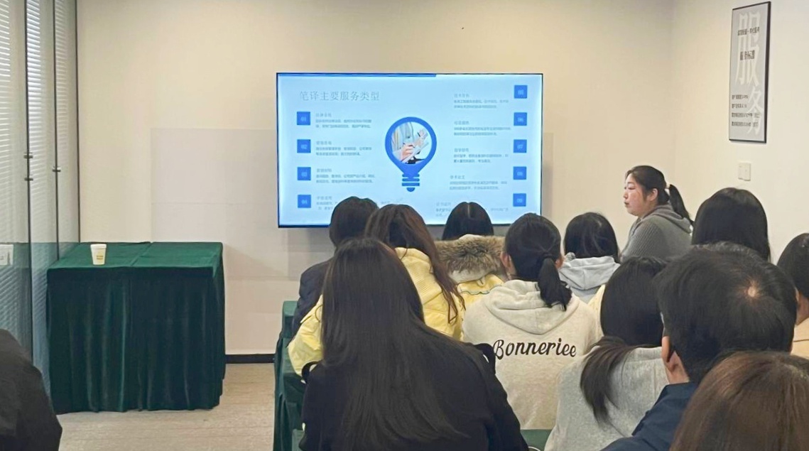 活动伊始,郑州译线通翻译有限公司邢亚娟老师热情接待了师生一行,并带领大家有序参观公司办公区域。随后,郑州译线通翻译有限公司鲍俐利女士为同学们带来了一场主题鲜明的翻译行业专题报告。报告中,鲍俐利女士从当前翻译行业的发展趋势切入,结合自身丰富的从业经验,深入剖析了德语翻译在跨境贸易、文化交流、科技合作等领域的应用场景与市场需求。同时,她还针对同学们关心的“译员核心素养”“职业发展路径”“行业竞争优势”等问题展开讲解,强调扎实的语言功底、跨文化沟通能力以及持续学习意识对成为优秀译员的重要性。报告内容干货满满,既有行业宏观分析,又有实用的职业建议,让同学们对德语专业的就业方向和发展潜力有了更清晰的定位。