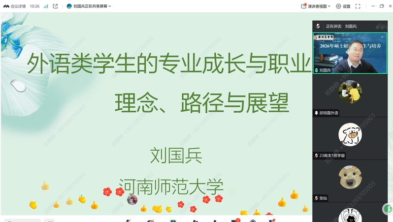 10月21日,外国语学院“研途领航——2026年硕士研究生招生与培养专题系列讲座”第三场如期开讲。本场讲座特邀河南师范大学外国语学院院长刘国兵教授担任主讲,以“外语类学生的专业成长与职业理念、路径与展望”为主题,为学子们深入阐释师范类外语人才的培养特色与科学备考策略。讲座由教务处邱培磊处长主持,外国语学院曹晓晨副院长、全体考研班学生及各专业考研指导教师在线参与。