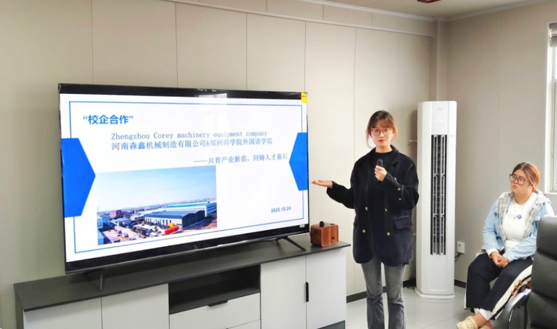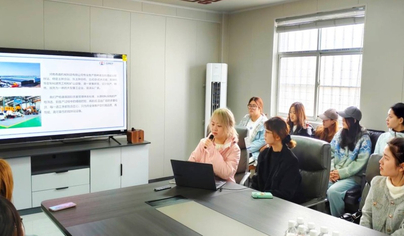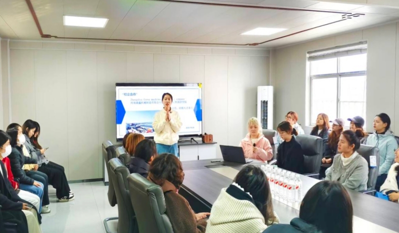 首先,森鑫机械人事部负责人张梦娇详细介绍了公司的发展历程、主营业务板块以及外贸出口情况,让学生对于一家集生产、销售、出口为一体的工贸一体企业的实际运作有了直观而深入的了解。