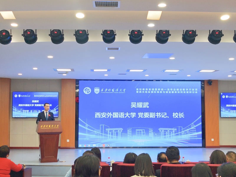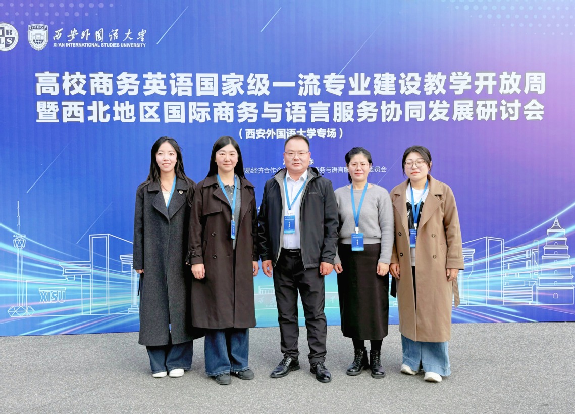2025年11月1日至11月2日,由中国对外贸易经济合作企业协会国际商务与语言服务工作委员会主办、西安外国语大学英文学院承办的高校商务英语国家级一流专业建设教学开放周(西安外国语大学专场)暨西北地区国际商务与语言服务协同发展研讨会在西安外国语大学雁塔校区成功举办。我校教务长邱培磊、外国语学院副院长曹晓晨、外国语学院商务英语教研室主任葛莹辉、教师段田园、冯宜丹外出参会学习。