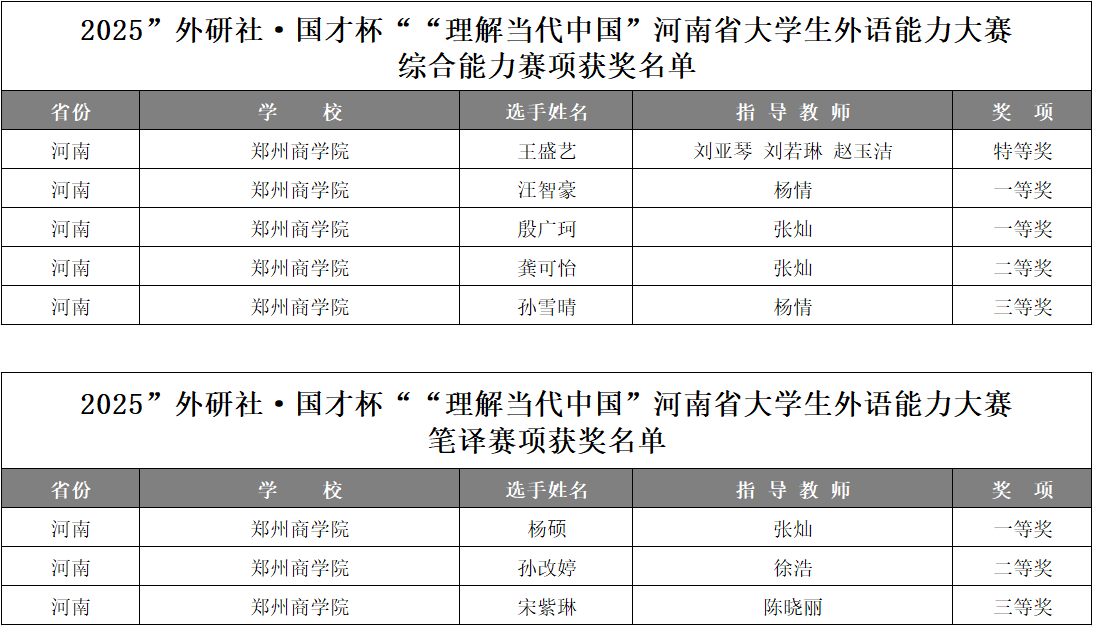 11月7日,2025年“外研社·国才杯”“理解当代中国”河南省大学生外语能力大赛获奖名单公布。我校参赛选手在综合能力大赛与笔译大赛中表现亮眼,斩获特等奖1项、一等奖3项、二等奖2项、三等奖2项,其中综合能力赛道的王盛艺同学成功进入国赛,丰硕的成果彰显了我院外语教学改革与人才培养的扎实成效。