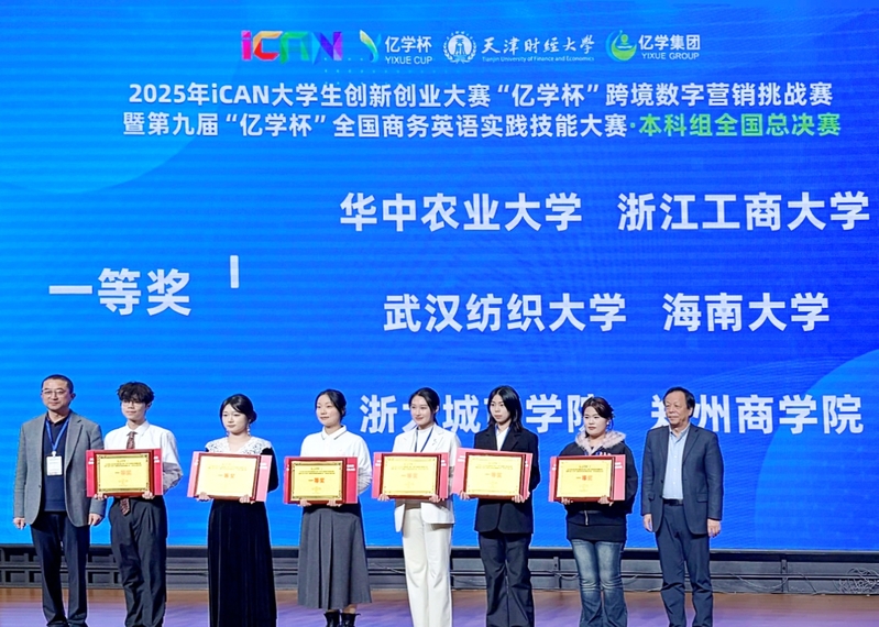 2025年11月28-30日,2025年iCAN大学生创新创业大赛“亿学杯”跨境数字营销挑战赛全国总决赛暨第九届“亿学杯”全国商务英语实践技能大赛总决赛在天津财经大学举办,来自全国的60支队伍同台竞技。我院商务英语专业苏宝英老师指导的由22级学生王芸、郭柯羽、金艺恩、李香颖,23级学生李沁妍所组建的“Nova”团队斩获全国一等奖。