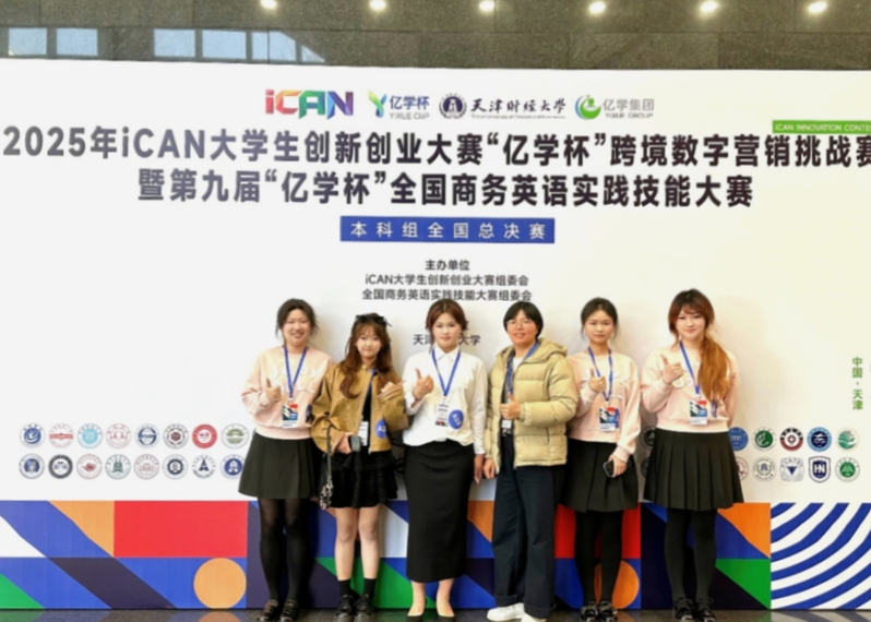 2025年11月28-30日,2025年iCAN大学生创新创业大赛“亿学杯”跨境数字营销挑战赛全国总决赛暨第九届“亿学杯”全国商务英语实践技能大赛总决赛在天津财经大学举办,来自全国的60支队伍同台竞技。我院商务英语专业苏宝英老师指导的由22级学生王芸、郭柯羽、金艺恩、李香颖,23级学生李沁妍所组建的“Nova”团队斩获全国一等奖。