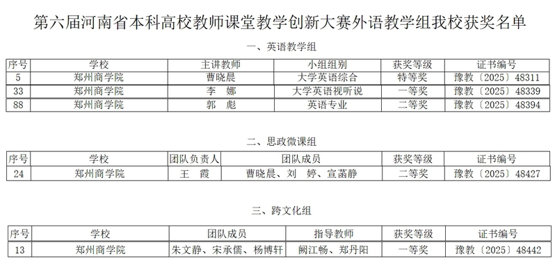 近日,由河南省教育厅主办的第六届河南省本科高校教师课堂教学创新大赛外语教学组比赛结果正式揭晓。经过校级初赛、省级复赛、省级决赛等多轮激烈角逐,我院教师凭借扎实的教学功底、鲜明的创新理念和出色的课堂呈现,在多个组别中脱颖而出,喜获特等奖1项、一等奖2项、二等奖2项,充分彰显了我院外语教学改革成效与师资队伍建设水平。