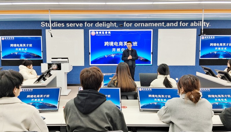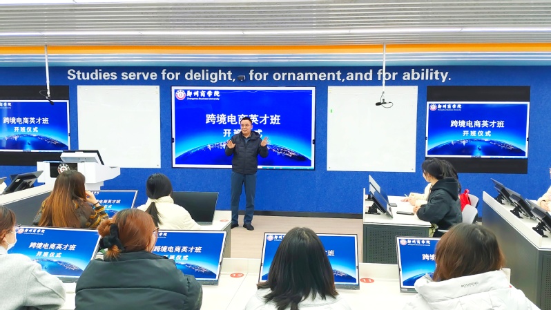 为深化校企协同育人、赋能学生高质量就业,12月17日,跨境电商行业学院于外语楼101教室举行“第三届跨境电商英才班”开班仪式。本次活动由商务英语专业葛莹辉主任主持,我院党委书记王克志、副院长曹晓晨、商务英语教研室部分教师及英才班全体学员共同参与,巩义市润达管道设备制造有限公司总经理贺清涛作为特邀嘉宾出席仪式。