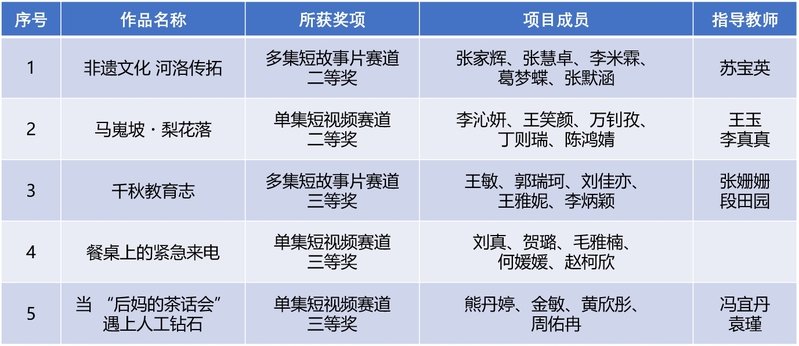 路演环节,我院学子凭借扎实的数字技能、清晰的逻辑思维和出色的现场表达能力,充分展现了外语学子跨学科融合创新的潜能与风采。最终,我院 “马嵬坡·梨花落”团队荣获单集短视频赛道全国二等奖,“非遗文化·河洛传拓”团队荣获多集短故事片赛道全国二等奖;其余三支队伍“千秋教育志”、“餐桌上的紧急来电”、“当‘后妈的茶话会’遇上人工钻石”均获得全国三等奖。