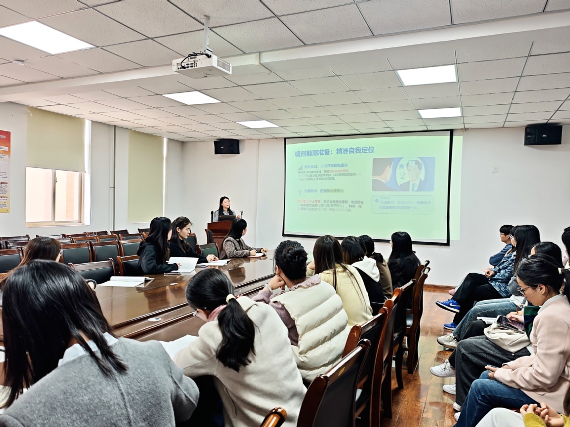 培训会上,主讲人郑静静老师结合2026年全国考研形势及外语类专业特点,系统梳理了从前期准备、信息搜集、院校筛选、志愿填报到沟通联系的全流程操作要点,重点强调了“冲刺—稳妥—保底”梯度志愿策略、黄金48小时填报时机以及材料准备规范等实用技巧。此外,郑老师还就调剂沟通话术、导师邮件撰写、信息甄别、志愿冲突应对等细节做了专项说明,提醒考生警惕虚假调剂信息与诈骗陷阱,注重沟通礼仪与材料呈现,以规范高效的操作提升调剂成功率。