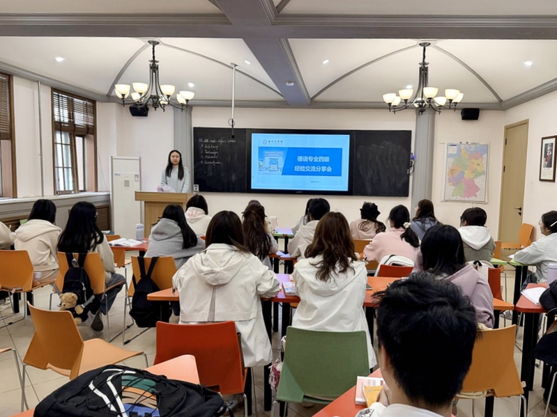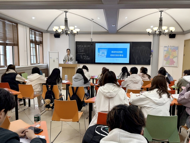 为帮助24级德语专业学生科学备战6月德语专业四级考试,4月7日上午,德语专业四级经验分享交流会在外语楼118教室顺利举行。活动由德语教师侯聪聪主持,特邀23级成绩优异的陈妍晓、张建阁两位同学分享经验,24级全体德语专业学生参与。