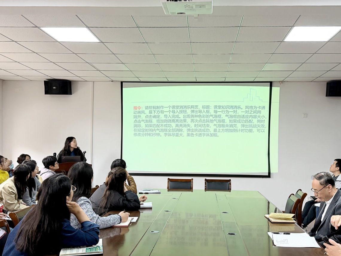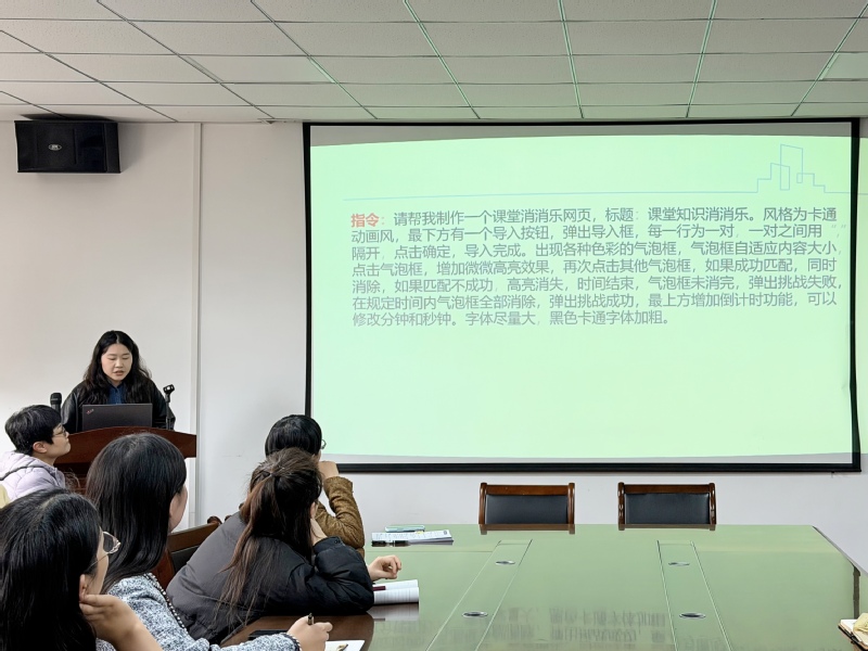 现场演示环节中,刘婷老师分享了利用生成式人工智能(AIGC)快速制作课堂互动小游戏的全流程。她借助AI后台底层代码框架,详细演示了如何通过输入教学目标、知识点难度和游戏形式等关键词在短时间内实时生成可运行的互动游戏脚本。这种低门槛、高效率的制作方式,不仅显著降低了教师的技术操作负担,更将课堂互动从固定预设推向智能生成,让每一堂课都拥有专属的“轻量化教学工具箱”。在交流研讨环节,与会教师围绕游戏脚本代码生成等技术难点展开深入交流,现场研讨氛围热烈。