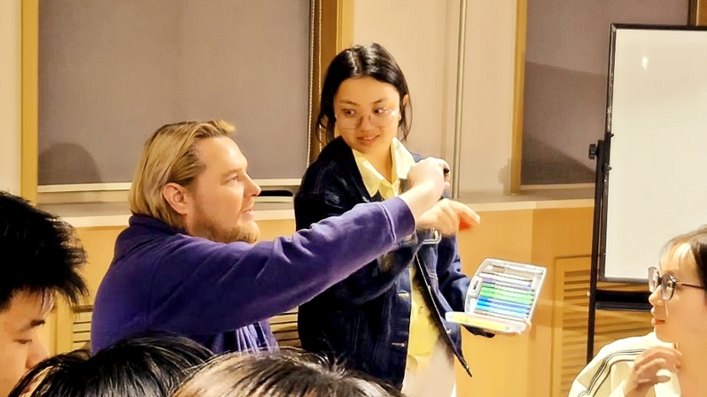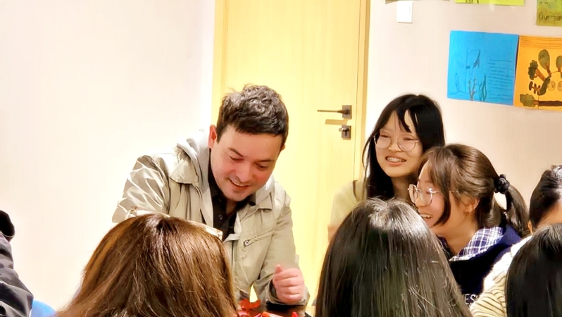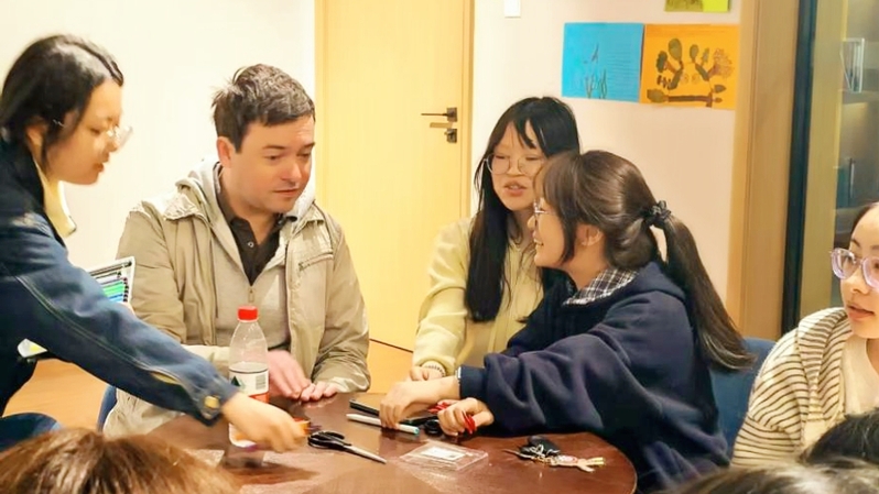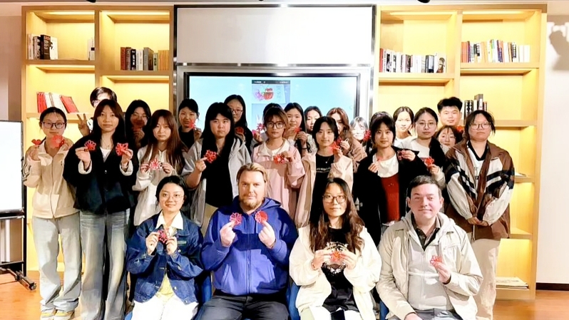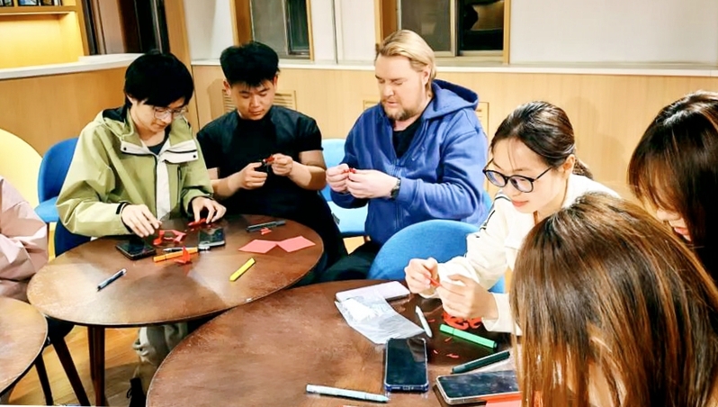 活动现场氛围热烈,Rafayel从历史脉络切入,介绍了剪纸艺术的发展历程,解读了其承载的民俗文化基因与精益求精的工匠精神。同学们积极用英语积极讨论,进一步领悟中国剪纸所折射的社会变迁与文化内涵。手工体验环节,同学们用英语描述剪纸的折叠、剪裁技巧,讲述其从民间技艺到国家级非遗的演变以及其在当代社会的创新表达形式。外教Anton分享了自己的剪纸实践心得,他表示,中国剪纸不仅是一种传统技艺,更凝聚着中华民族的坚韧品格,其独特的艺术魅力对世界各国观众具有强烈的吸引力。