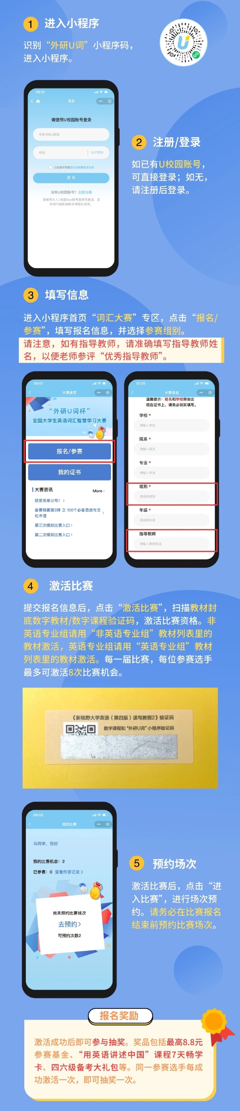 2.参赛学生需使用外研社出版的高等英语教材封底数字课程验证码激活比赛机会。