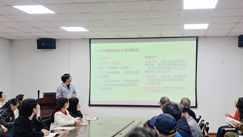 会上,郜老师解读了我院2026届本科毕业论文答辩工作安排,包括答辩资格审查、评审和答辩要求、现场答辩流程、附件的填写以及其他注意事项,并结合自身的指导经验对答辩前需要做的准备,答辩过程中如何使用AI工具辅助记录,以及答辩后如何与学生沟通进行了分享。