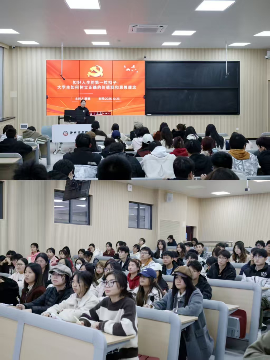 为引导入党积极分子在思想成长初期把准方向、守好初心,切实夯实正确价值观的思想基础,10月23日下午18:30,机电工程学院第四十一期入党积极分子党课第三讲在躬行楼JT102教室如期开展。本次党课以“扣好人生的第一粒扣子:大学生如何树立正确的价值观和理想信念”为主题,由机电工程学院学生第一党支部书记栗璐同志主讲,第四十一期入党积极分子全体参加。