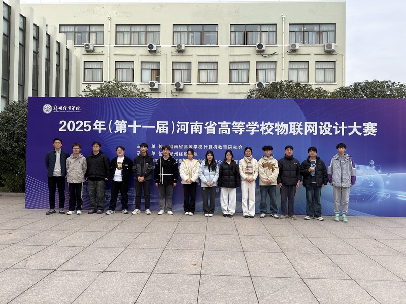 11月22日,2025年(第十一届)河南省高等学校物联网设计大赛在郑州经贸学院圆满落幕。该赛事由河南省高等学校计算机教育研究会主办,以物联网行业项目和创新产品为导向,激发学生的创造、创新、创业活力,为省内高校物联网领域学子搭建了展示创新能力、交流实践成果的重要平台。机电学院12名同学组成4支队伍,在刘磊、韩徐老师的带领下,前往郑州经贸学院参加比赛。