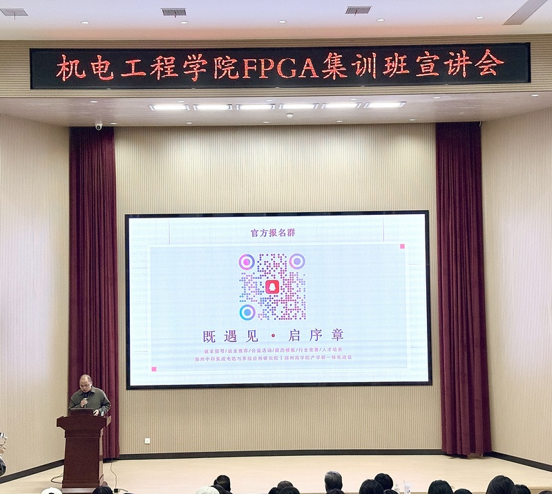 为深入推进产教协同育人,助力智能制造领域高素质应用型人才培养,2026年4月2日下午16:00,机电工程学院在三彩校区躬行楼一楼报告厅举办FPGA集训班宣讲会。学院特邀郑州中科集成电路与系统应用研究院胡修太老师作主题宣讲,2023级电子、物联网专业就业班全体学生参加本次宣讲会。