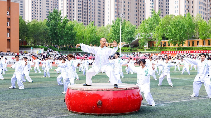 开幕表演精彩纷呈,参演同学们用精湛的技艺和饱满的热情为大家带来了一场视觉盛宴。队形操表演《奔跑的青春》,以青春之名,用整齐划一的动作和充满活力的队形变换,点燃全场热情,他们将现代流行元素与团体操完美融合,通过流畅的走位、创意的造型和极具感染力的表现,展现郑商学子的蓬勃朝气与团队精神;微风缱绻,舞蹈串烧《九州同》,在折扇开合间,东方美学的含蓄与典雅跃然而出,她们以刚健婀娜之姿,编织着一幅绚烂多彩、百花争艳的动人画卷,演绎着坚韧不拔、永不言弃的体育信念。中华战舞《玉盘》鼓声响彻云霄,呼吁着郑商学子勇担中华民族伟大复兴历史重任,将五千年豪情转化为阳刚之气,在新时代发出铿锵回响。