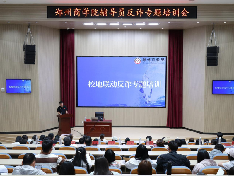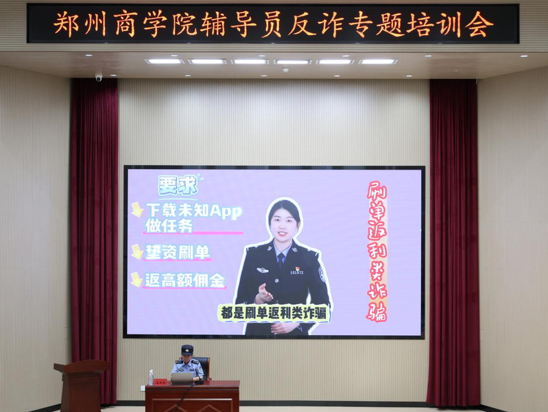 为提升辅导员防范电信诈骗的工作能力,5月12日上午,郑州商学院联合地方反诈部门在三彩校区躬行楼报告厅开展校地联动反诈专题培训。本次培训会由学务处副处长贺萌主持,紫荆路社区民警李丹丹警官主讲,全体辅导员共同参加。