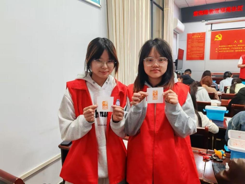 在印雕课堂上,专家以渊博学识为引,从古老印雕起源讲至历代传承,从中国的四大名石到中国四大名玉,列举了阴雕、阳雕、浮雕、透雕等等传统雕刻技巧。深挖其根源用生动案例剖析文化内涵;右手持刻刀,边实操演示边细致拆解运刀、构图等雕刻技巧。耐心指导学生们亲手实践,鼓励他们在创作中感受传统工艺的魅力。大学生志愿者从握刀姿势到印泥调制,青年们将课堂所学转为实践完成人生首枚篆刻作品。活动现场,志愿者们以饱满的热情投入非遗教学中,充分展现了大学生们对于中国传统文化的热爱。