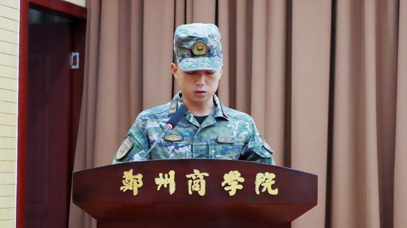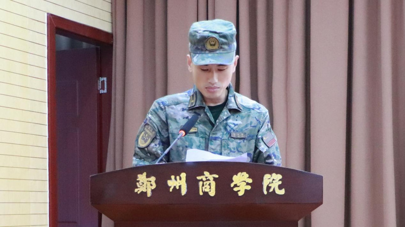 金贸学院雷云翔作为新生辅导员代表发言。他表示,作为一名辅导员、一名退伍军人,将和教官密切配合,把训练计划和日常教育进行结合,引导学生把校训精神真正内化为行为准则,助力新生锤炼品格、收获成长。