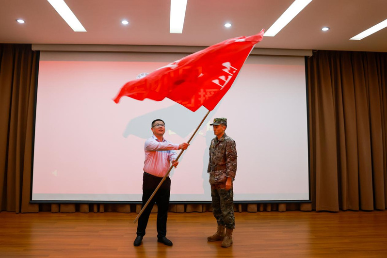 大会最后,校党委副书记兼纪委书记裴晓涛向军训团授旗。