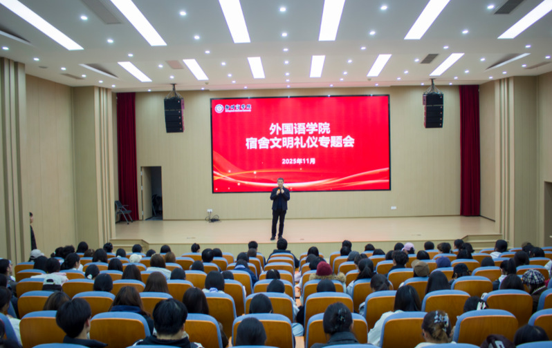 为进一步加强宿舍文化建设,培育学生文明素养,11月13日,外语学院在体育馆负二楼报告厅召开宿舍文明礼仪专题会。外语学院党委书记王克志、学务处宿管科科长陈勇彬、外语学院团委书记王子浩、学院全体辅导员及大一大二全体宿舍长参会,会议由辅导员王忠芝主持。