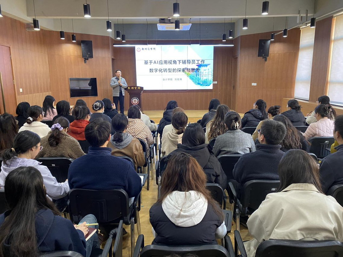 为夯实辅导员育人根基,推动学生工作数字化转型与高质量发展,进一步提升队伍专业化、职业化建设水平,11月12日,我校在学生事务服务中心三楼路演厅开展“基于AI应用视角下辅导员工作数字化转型的探索与思考”辅导员专题培训,此次培训由会计学院党委书记刘宏涛担任主讲,各学院入职3年以上的辅导员参会。
